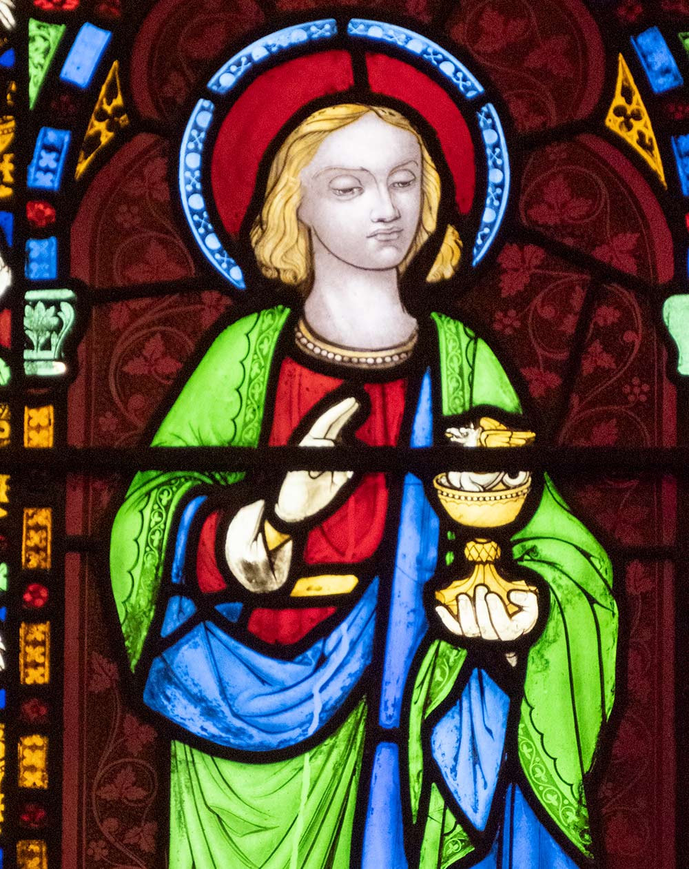 St John the Apostle holding a chalice with a serpent in it. Legend has it that John was given a poisoned chalice to drink but when he blessed it, the poison became harmless.